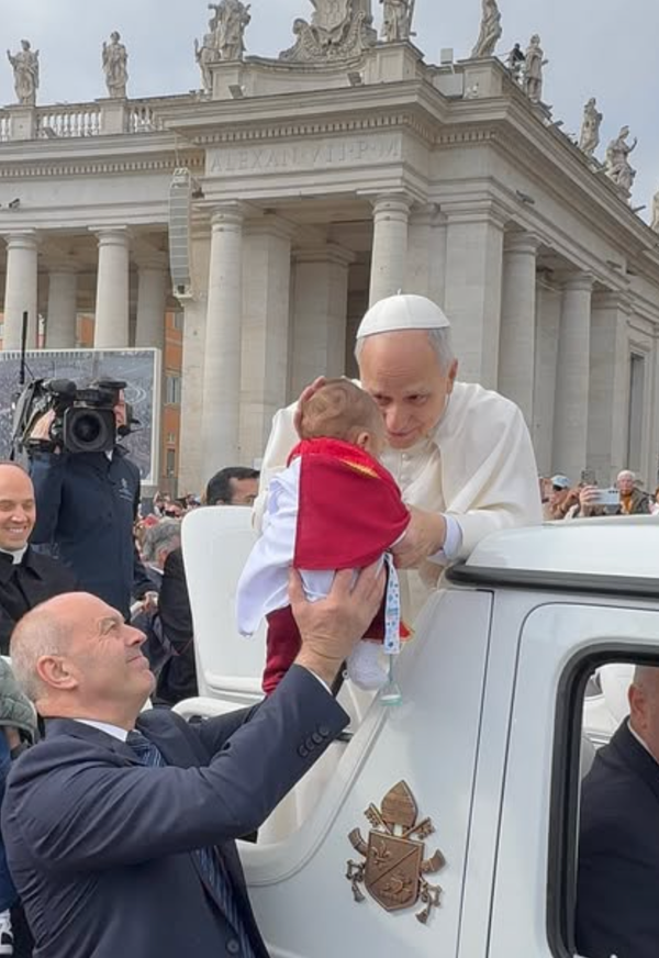Um bebê com batiola branca e solidéu chamou a atenção da guarda papal — e acabou nos braços do próprio Papa Leão XIV na Praça de São Pedro.