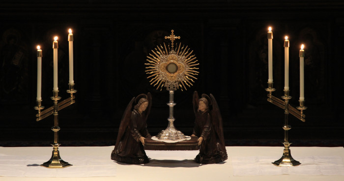 E uma maneira pela qual os católicos mostram sua fé na presença real de Jesus na Eucaristia é a adoração eucarística, uma prática em que a Eucaristia é exibida publicamente e adorada pelos fiéis.