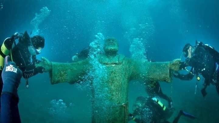 Uma incrível estátua do Padre Pio atrai centenas de turistas que vão ao local para contemplar o rosto do santo nas profundezas.
