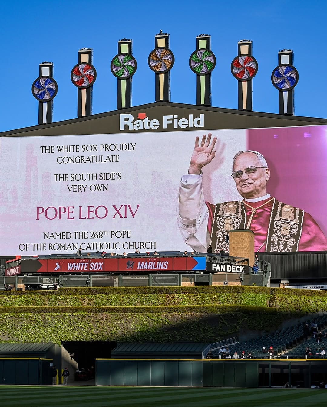 "O White Sox orgulhosamente parabeniza nosso próprio Papa Leão XIV, vindo do Sul de Chicago, nomeado como..."