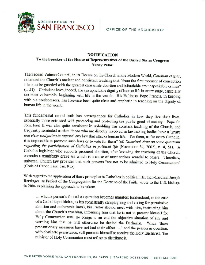 “Depois de inúmeras tentativas de falar com ela para ajudá-la a entender o grave mal que ela está cometendo, o escândalo que ela está causando e o perigo para sua própria alma que ela está arriscando, eu determinei que chegou o ponto em que devo fazer uma declaração pública de que ela não deve ser admitida à Sagrada Comunhão a menos e até que ela repudie publicamente seu apoio aos ‘direitos’ ao aborto e confesse e receba a absolvição por sua cooperação neste mal no sacramento da Penitência”.