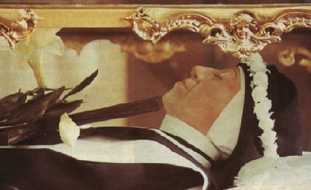 “Não deixou de ser um fato desconcertante: em meio à destruição quase total da urna de madeira, devido à umidade do subsolo, seu corpo intacto com o traje religioso em perfeito estado e a cruz de madeira junto ao caule do buquê de lírios com as folhas ainda verdosas”.