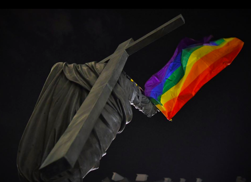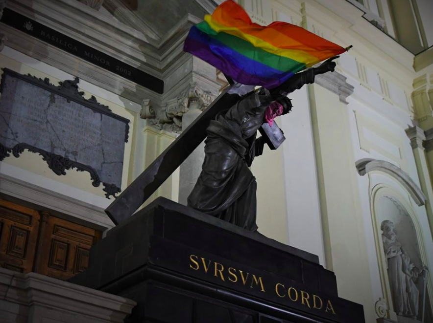 Anarquistas e militantes do “orgulho gay” profanaram um monumento de Jesus carregando a cruz ontem, em Varsóvia, na Polônia. O grupo colocou uma bandana com um símbolo anarquista no rosto de Jesus e uma bandeira de arco-íris na cruz.