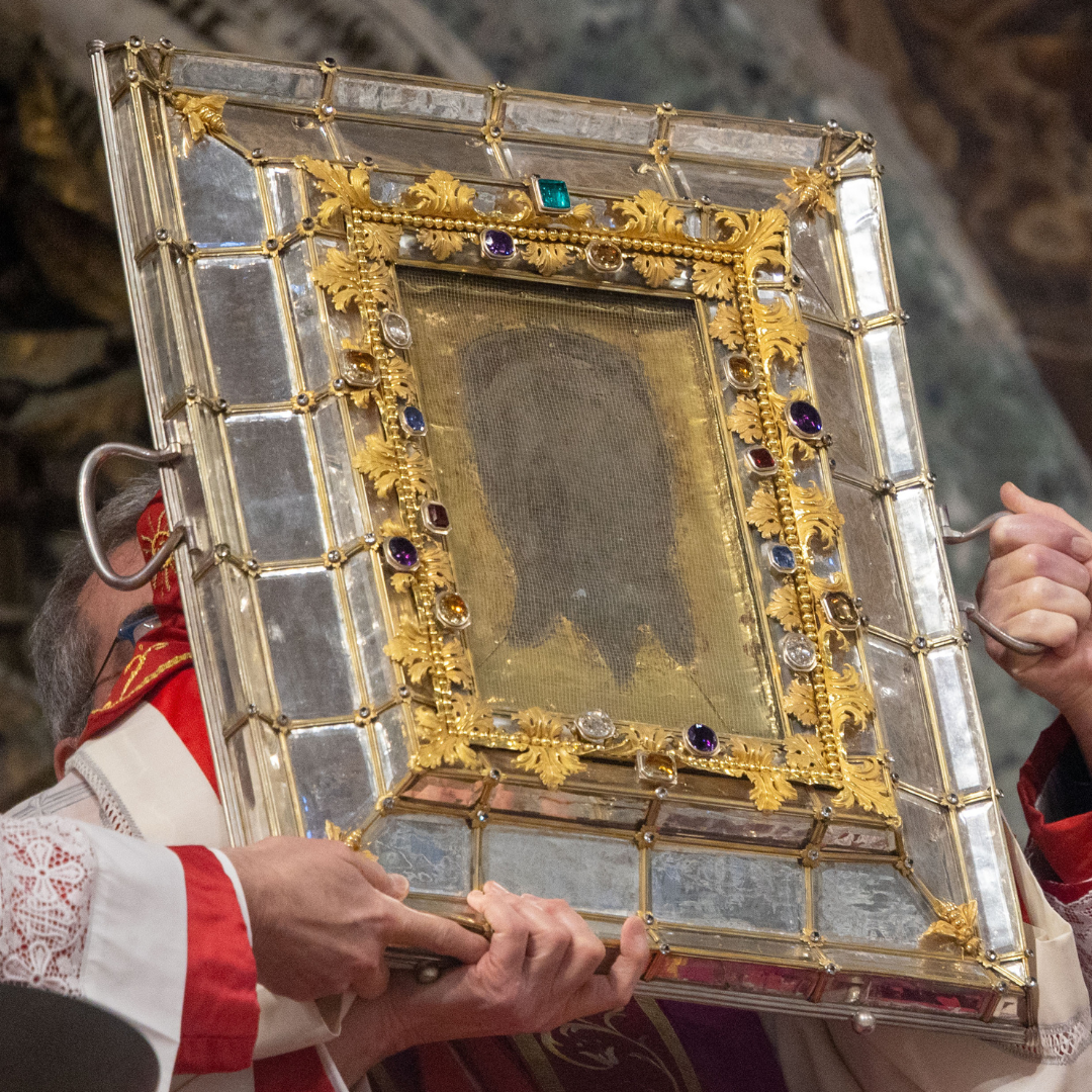 De acordo com a tradição, esse pano traz a verdadeira imagem do rosto de Cristo e foi preservado pela Basílica do Vaticano.