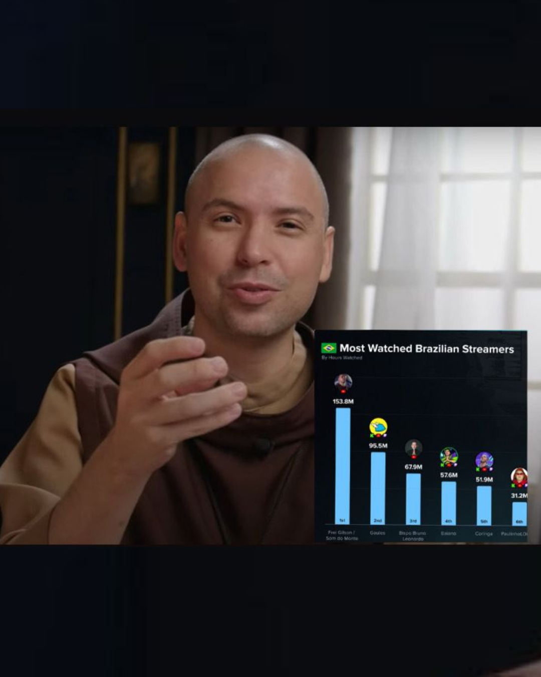 “A maior surpresa da lista é o líder do ranking, Frei Gilson, que transmite exclusivamente no YouTube. Seus vídeos são centrados na oração e no louvor, acumulando 153 milhões de horas assistidas em 2025.”