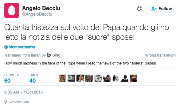 Papa Francisco ficou “triste” ao ouvir que duas ex-freiras lésbicas deixaram a vida religiosa para se “casar”, na Itália, de acordo com o subsecretário de Estado do Vaticano, Dom Angelo Becciu no Twitter.