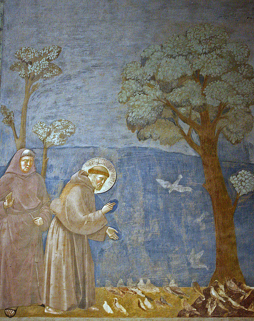 A imagem lembra o quadro “Sermão aos pássaros”, pintado por Giotto: